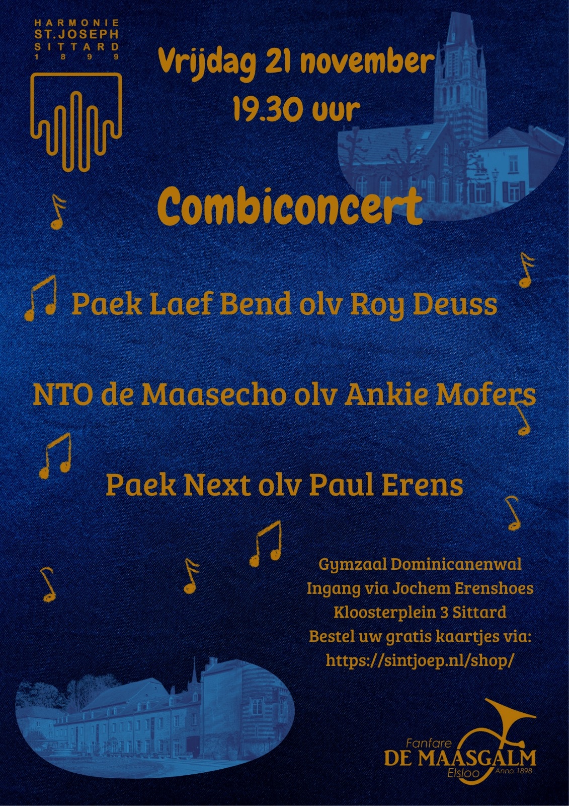 Het concert start om 19.30 uur en vindt plaats in de Gymzaal Dominicanenwal. Ingang via het Jochem Erenshoes (Kloosterplein 3, Sittard)